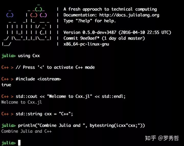 甚至还可以在 Julia 的 REPL 里把 C++ 当成动态语言来写,按 < 键进入 C++ 模式(Julia 的 C++ FFI:Cxx.jl,暂时还没更新到 1.0,需要 0.6)