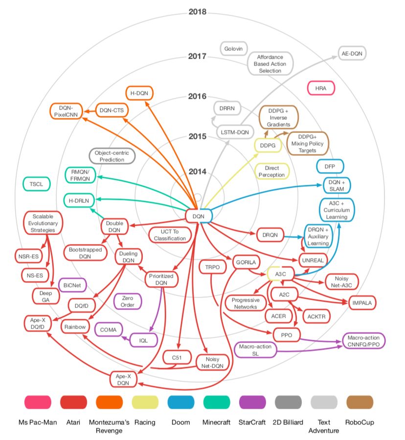 上图显示了各种 深度学习 方法以及它们之间互相影响的示意图(下面的部分相当于对此图的长篇解读)。图中的每一种方法都被着色了,以显示出用于对比的游戏 基准 。
