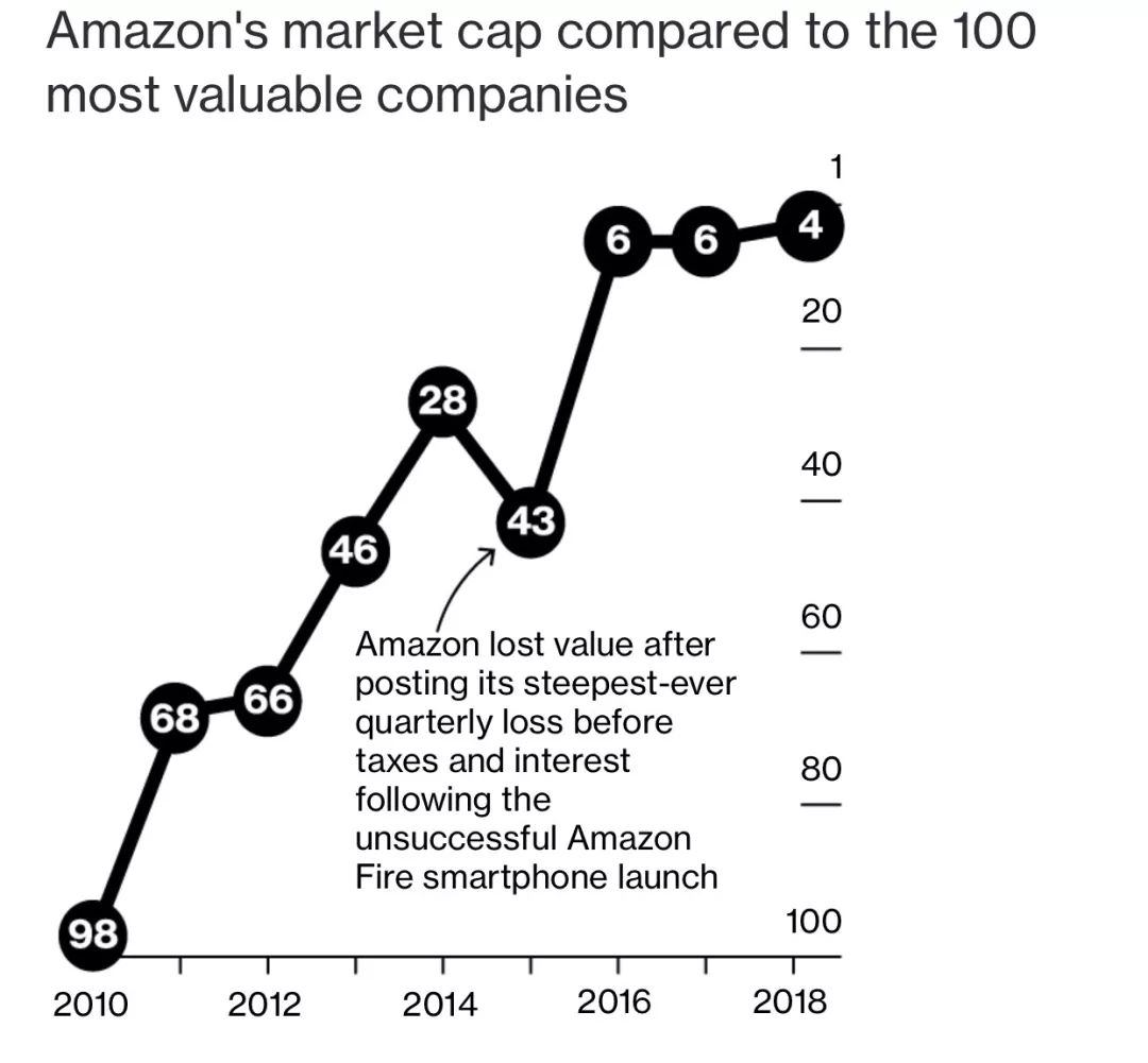 投资者失去耐心。在 2014 年,亚马逊的股价下跌超过 20%,使得该公司的市值远低于沃尔玛和中国的阿里巴巴。
