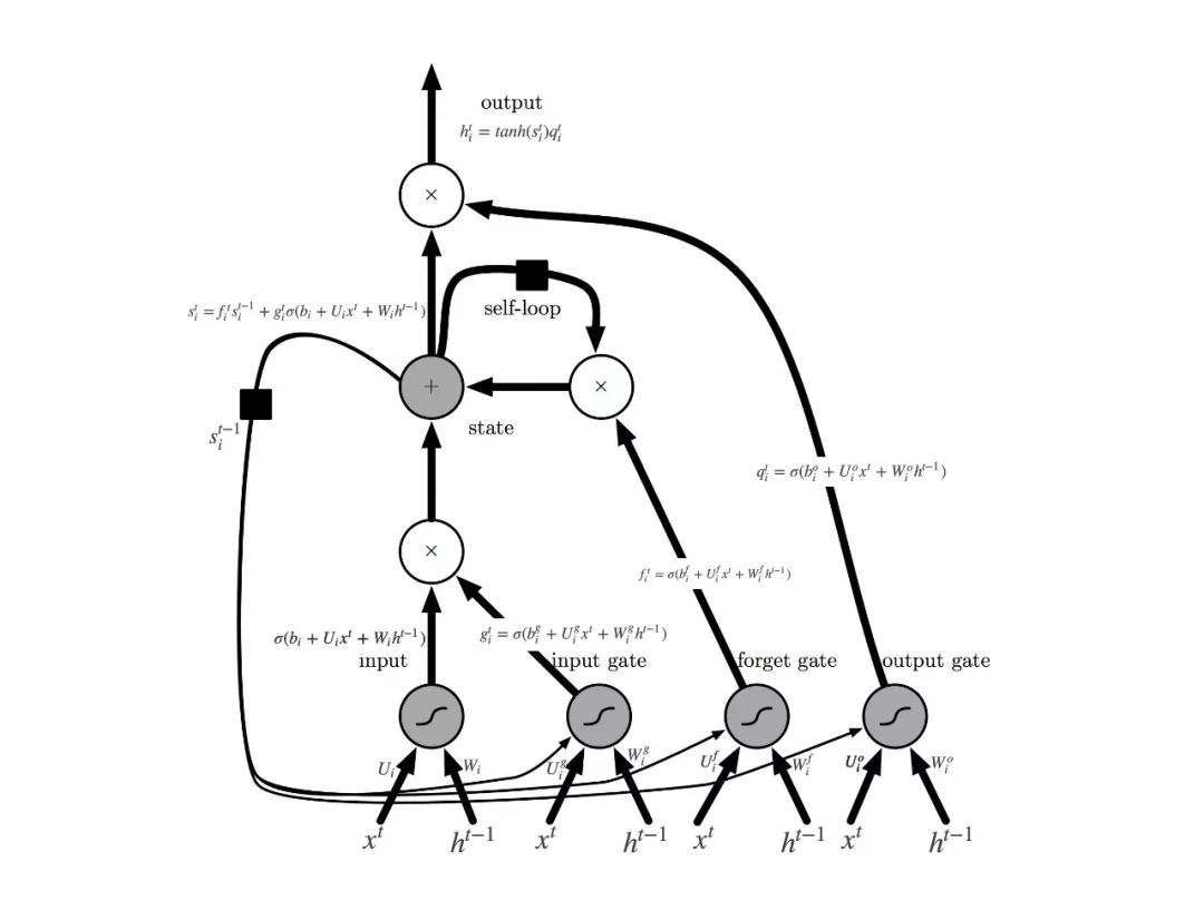 Goodfellow 表示记忆 s^t-1 也可以用作门控单元的额外输入(如上图所示),但一般 LSTM 的门控单元只使用前一时间步的输出 h^t-1 作为输入,因此我们也不太确定怎样才能使用 s^t-1 作为门控单元的额外输入。