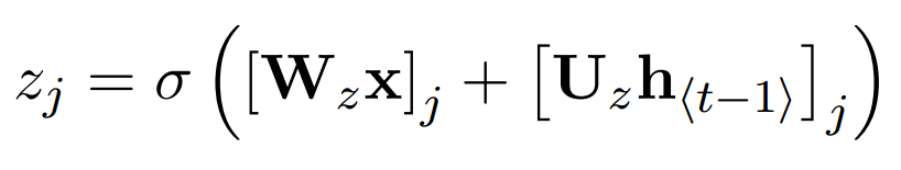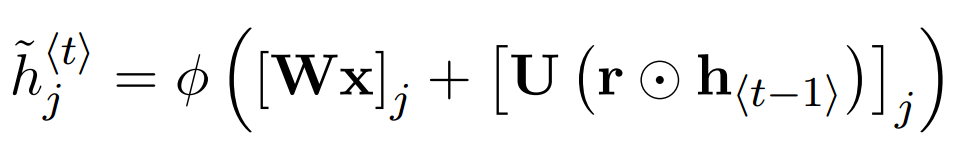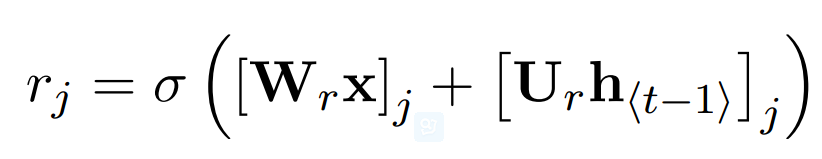 以下将描述第 j 个隐藏单元激活值的计算方式。首先重置门 r_j 的计算式可以表示为: