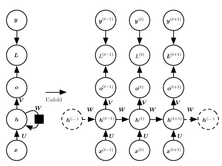 以上展示了这种循环连接发生在隐藏层之间的网络,其中 x 和 y 分别代表数据点与对应的标注,h 为隐藏单元或循环体,L 是预测值与标注值之间的距离与损失。一般在第 t 个时间步,我们会输入数据 x^t,并计算隐藏状态 h^t = tanh(W*h^{t-1}+U*x^t),随后 h^t 将传入下一个时间步与当前时间步输出的对数概率 o^t = c + V*h^t。最后我们就能根据输出与标注值计算模型损失。