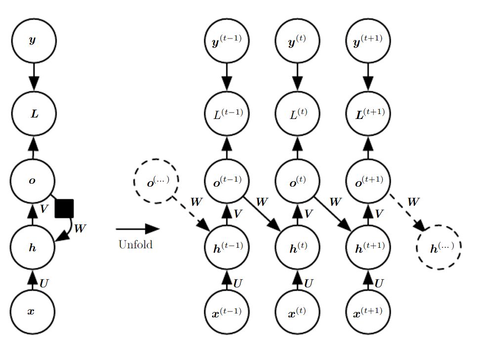 以上只是从概念上解释循环网络,我们并没有具体学习循环网络的架构与模块,下一部分我们将以计算图的形式具体展示循环网络的结构,包括常见的展开式与不同的变体架构等。
