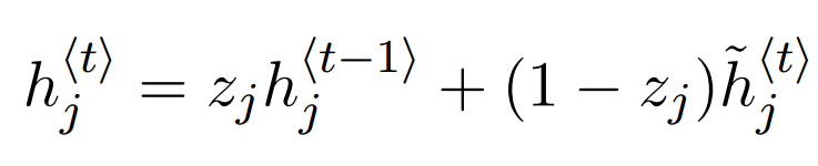 其中 Φ 为激活函数,一般我们可以选择 tanh。在计算 h tilde 后,我们可以根据下式组合它与前面时间步的隐藏状态,而最终得到当前时间步下该单元的激活值或隐藏状态:
