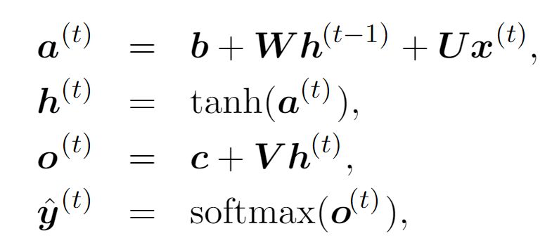 其中在第 t 个时间步上的输入 x^t 可以是一个词嵌入向量或简单地使用 One-hot 编码。一般权重矩阵 U 的维度为 [词嵌入长度 * 隐藏层的单元数],偏置向量 b 的维度等于隐藏层单元数。隐藏层输出的向量(每一个元素为隐藏单元的激活值),我们在将隐藏层向量执行仿射变换后,可将 o 视为未归一化的对数概率,并计算 softmax 以和标注的词嵌入向量进行对比。