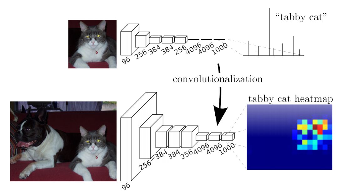 如上所示,全卷积网络将预测类别概率(上)转化为像素级的预测(下)。
