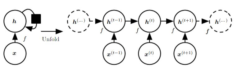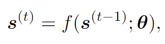 其中 x^t 表示第 t 个时间步上的输入,当前时间步的隐藏状态取决于前一时间步的隐藏状态、当前时间步和所有时间步都有相同的参数θ。我们同样可以将该表达式展开,例如 h^3 = f(h^2, x^3; θ) = f(f(h^1, x^2; θ), x^3; θ)。