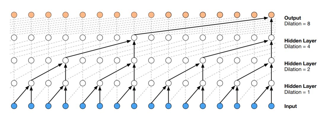 一般在使用空洞卷积时,我们将随着网络深度 i 的增加而指数级地增大 d,即 d=O(2^i)。这确保了卷积核在有效历史信息中覆盖了所有的输入,同样也确保了使用深度网络能产生极其长的有效历史信息。