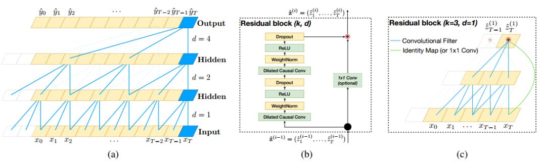 TCN 论文图 1:TCN 架构的组成元素。(a)为空洞系数 d=1, 2, 4、卷积核大小 k=3 的空洞因果卷积,感受野能覆盖输入序列中的所有值。(b)为 TCN 残差块,当残差输入和输出有不同的维度,我们会添加一个 1x1 的卷积。(c)为 TCN 中的残差连接示例,其中蓝线为残差函数中的卷积核,绿线为恒等映射。