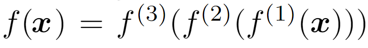 以下展示了三层全连接网络的抽象表示,其中 f^1 表示第一层或输入层,将第一层的值作为输入并计算第二层的激活值 f^2,然后将第二层的激活值作为输入计算第三层的激活值。这种复合函数展示了全连接网络的前馈传播过程,而将复合函数的链式求导法则作为反向传播算法也就显得十分自然。
