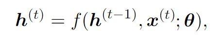 这样的表达式其实就展示了循环网络的本质。若我们具体考虑循环网络每一个时间步都存在输入,且使用变量 h 表示循环网络的隐藏状态(代替上述系统的状态),那么我们可以将一般的循环神经网络抽象为以下表达式: