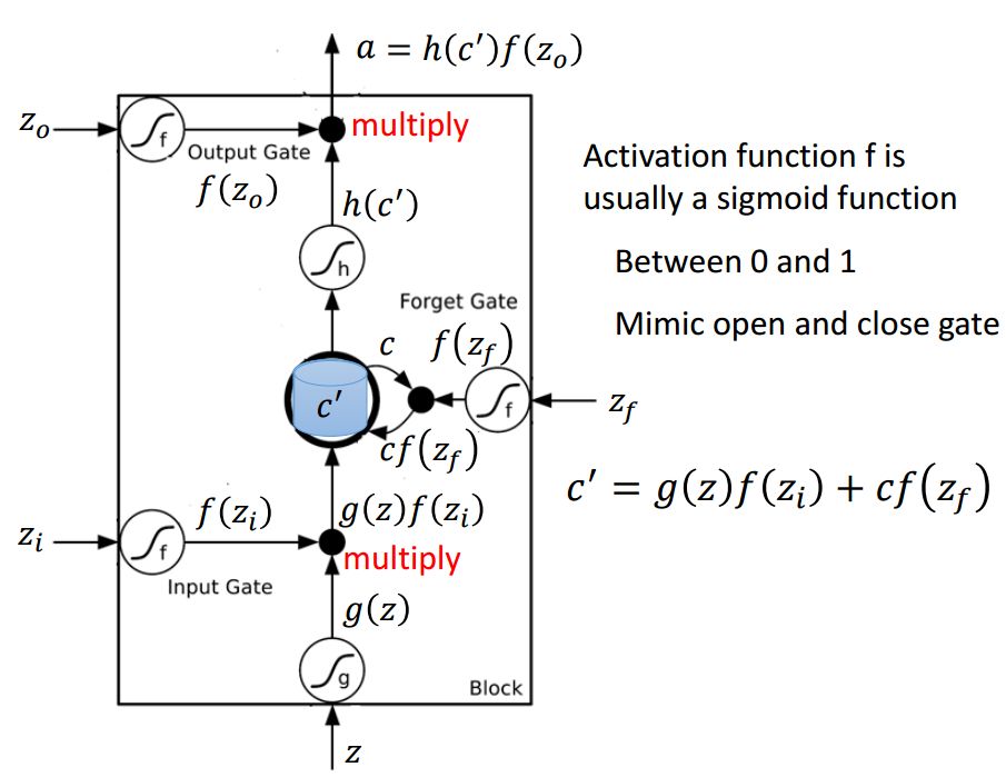 以下是 LSTM 单元的简要结构,其中 Z 为输入部分,Z_i、Z_o 和 Z_f 分别为控制三个门的值,即它们会通过激活函数 f 对输入信息进行筛选。一般激活函数可以选择为 Sigmoid 函数,因为它的输出值为 0 到 1,即表示这三个门被打开的程度。