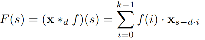 形式上,对于 1 维的输入序列 x ∈ R^n 和卷积核 f : {0, . . . , k − 1} → R,空洞卷积运算 F 可以定义为: