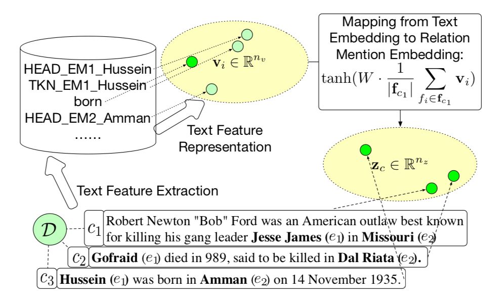 1. 文本特征的向量表示。从文本上下文中抽取出文本特征(基于pattern得到),简单的one-hot方法会得到维度非常大的向量表示,且存在稀疏的问题。为了得到更好的泛化能力,本文采用表示学习的方法,将这些特征表示成低维的连续实值向量;