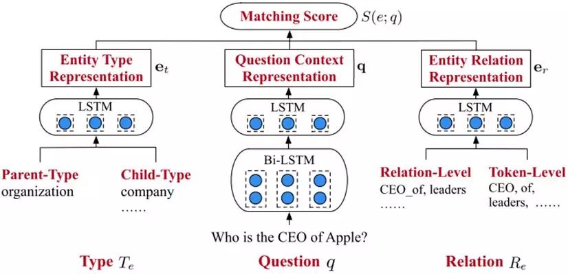 其二,是 实体类型编码器,即对于某个候选实体 e,得到其连接的类型,并将父类型以所有子类型向量之和表示,再将这些类型对应的向量输入一个 LSTM 中进行编码,得到实体类型的 d 维向量 et。