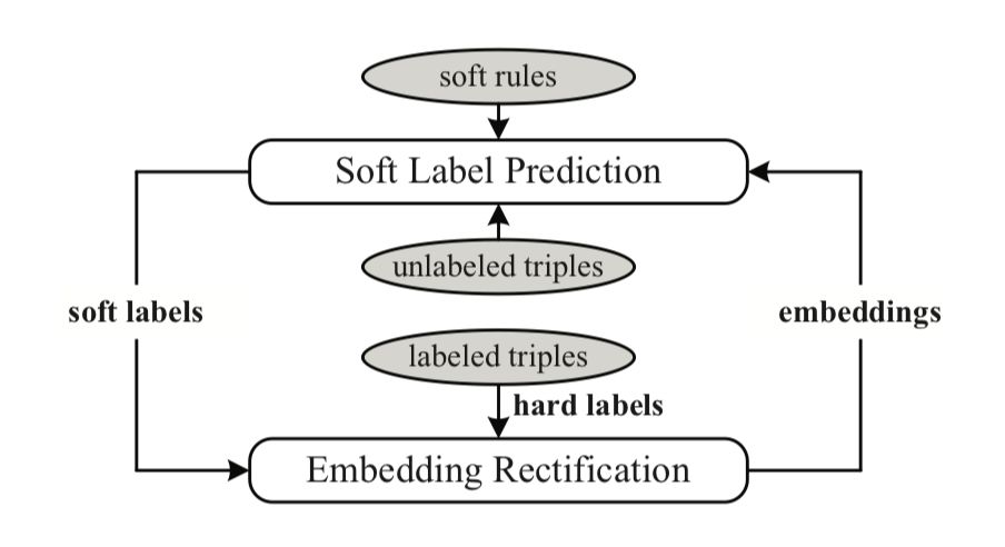 将预测了标签的三元组添加到 知识图谱 中,和已由的三元组一起进行训练,来修正向量学习,优化的 损失函数 目标如下: