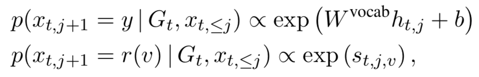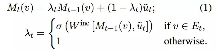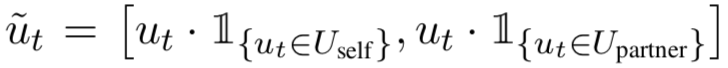 Mentions vector M_t(v) 表示在 t 时刻的对话中与节点 v 相关的上下文信息。对话的表示 u_t 由个 LSTM 络计算得到(后文会提到),为了区分 agent 自身产生的对话语句和另一个代理产生的对话语句,对话语句表示为: