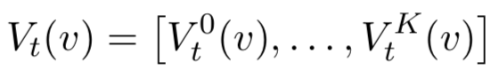 t 时刻 知识图谱 中每个节点的向量表示为 V_t(v),向量表示中包含了以下来源的信息:代理私有 知识库 的信息,共享的对话中的信息,来自 知识库 中相邻节点的信息。
