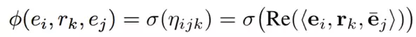 其中 Re<x> 表示取 x 实部的值,bar{e}_j 为 e_j 的共轭向量。正确的三元组得分函数值会较高而不正确的三元组得分函数的值会较低。