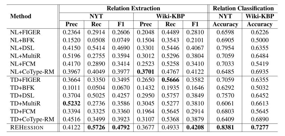 本文使用 NYT 和 Wiki-KBP 两个数据集进行了实验,标注来源一方面是 知识库 ,另一方面是人工构造的模板。每组数据集进行了包含 None 类型的关系抽取,和不包含 None 类型的关系分类。