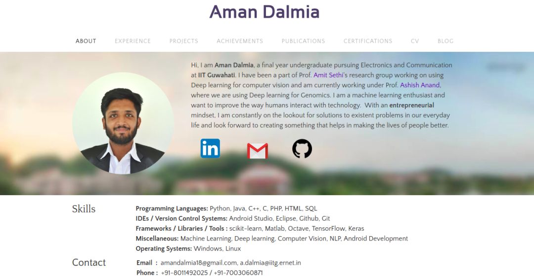 第三步是大部分人缺少的,即在招聘网站上展示自己的经历和个人项目。制作个人职业资料表示你非常严肃地考虑进入某领域,在真实性上加了很多分。此外,履历(CV)通常会有空间限制,可能会缺失一些重要细节。你可以在个人职业资料中深入介绍这些细节,推荐对项目/思路进行某种形式的可视化或其他展示。创建一份职业资料非常简单,有很多免费平台,通过拖放功能就可以实现这一过程。我个人使用 Weebly,这是个广泛使用的工具。开头有 reference 更好。有很多不错的例子,不过我参考了 Deshraj Yadav 的个人网站,制作了我自己的(http://amandalmia.weebly.com/):