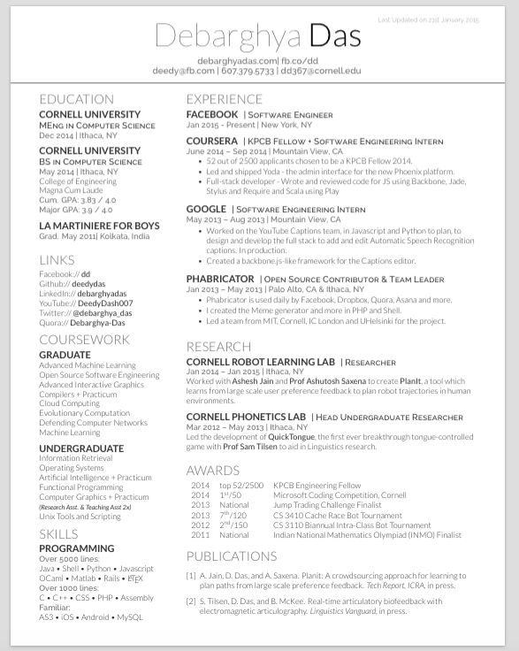 1)做好监管准备:即准备好领英档案、Github 档案、个人网站以及一份精心打造的简历等材料。首先,你的简历应该非常整洁和精炼。可以根据 Resume Revamp(https://career-resource-center.udacity.com/resume/resume-revamp)来 规划 简历,它包含我想说的所有有关简历的内容,我自己也一直用它作为参考。至于简历模板,Overleaf 上提供的一些格式很不错。我个人使用 deedy-resume(https://www.overleaf.com/),以下是预览: