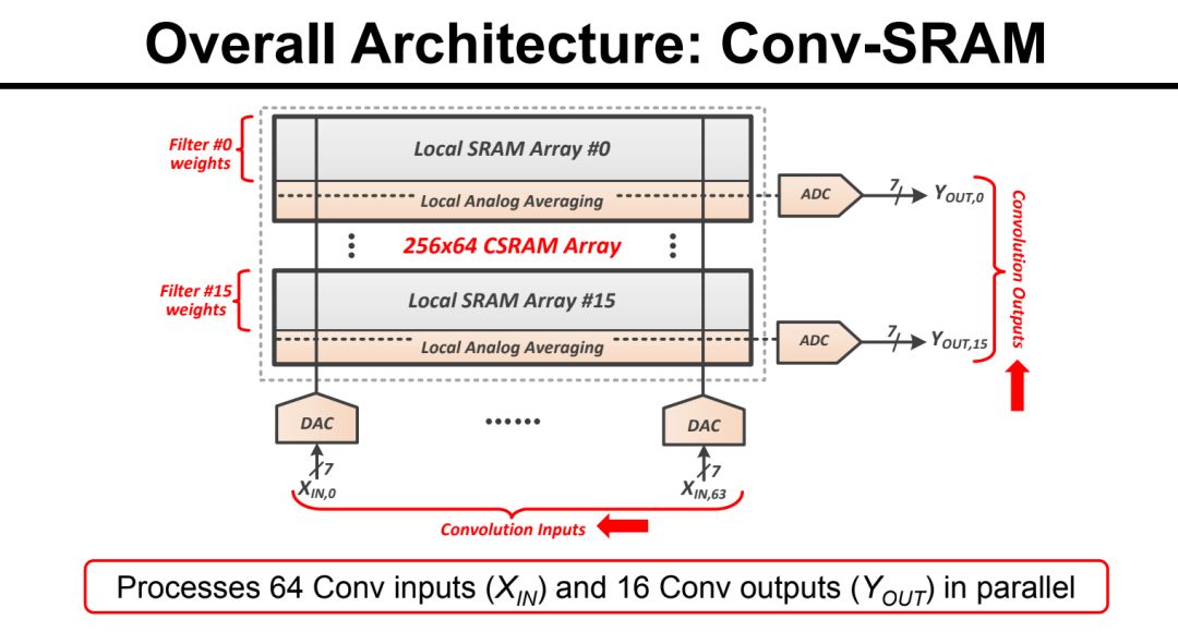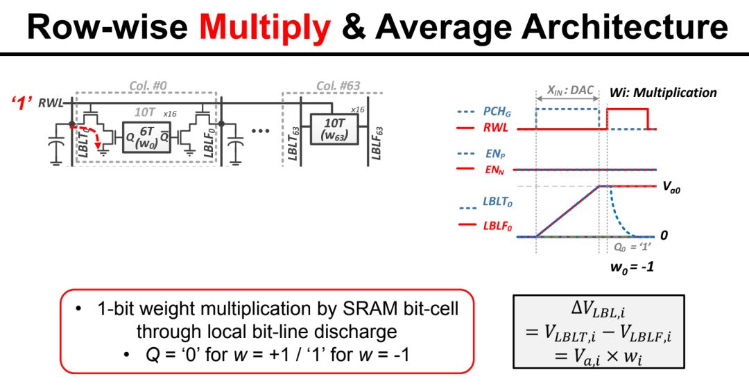 Conv-SRAM的具体实现如下图所示: 权重 (1-bit)储存在SRAM中,输入数据(7-bit数字信号)经过DAC成为 模拟信号 ,而根据SRAM中的对应 权重 ,DAC的输出在模拟域被乘以1或者-1,然后在模拟域做平均,最后由ADC读出成为数字信号,这个操作即MAV。