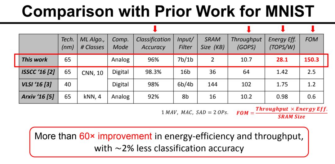 于是,使用Conv-SRAM和MAV,最终实现了在LeNET网络对MNIST数据集分类这个benchmark上60倍以的能效比提升,而分类精度降低了约2%。