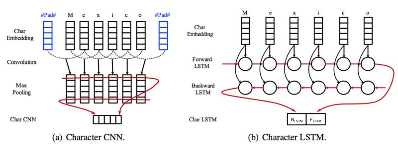 在词的表示方面,本文摒弃了基于传统的特征的方法,直接使用词本身的信息进行编码。除了词向量以外,为了更好地对那些不常见的词编码,文章使用 LSTM 或者 CNN 对构成词语的字符进行编码。