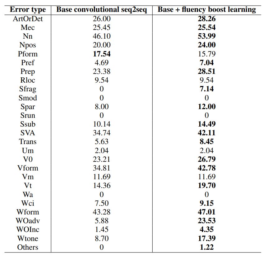 表 4:有/没有流畅度提升学习的卷积 seq2seq 模型在 CoNLL-2014 数据集的每个错误类型上的召回率对比。