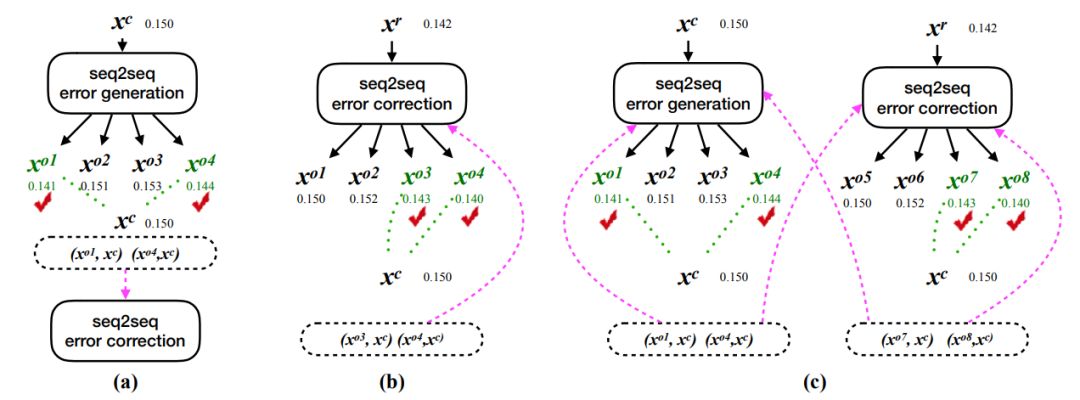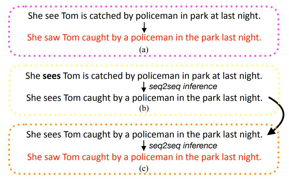 图 1:(a)纠错句对;(b)如果句子与训练数据有些微的不同,则模型无法完美地修改句子;(c)单轮 seq2seq 推断无法完美地修改句子,但多轮推断可以。