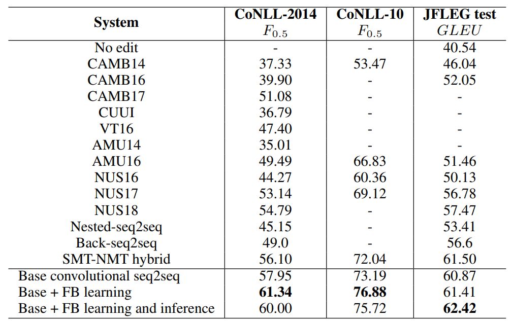 结合流畅度提升学习和推断与卷积 seq2seq 模型,微软亚洲研究院取得了当前最佳的结果,这使其成为首个在两个基准上都达到人类水平的 GEC 系统。