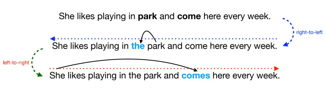 图 4:往返纠错:某些类型的错误(例如,冠词错误)由从右到左的 seq2seq 模型会更容易纠错,而某些错误(例如主谓一致)由从左到右的 seq2seq 模型更容易纠错。往返纠错使得二者互补,相对于单个模型能纠正更多的语法错误。