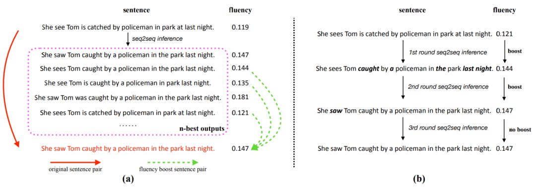 图 2:流畅度提升学习和推断机制:(a)给出一个训练实例(即纠错句对),流畅度提升学习机制在训练过程中从 seq2seq 的 n-best 输出中构建多个流畅度提升句对。流畅度提升句对将在后续的训练 epoch 中用作训练实例,帮助扩展训练集,帮助模型学习;(b)流畅度提升推断机制允许纠错模型通过多轮 seq2seq 推断渐进式地修改句子,只要句子的流畅度一直能够提升。