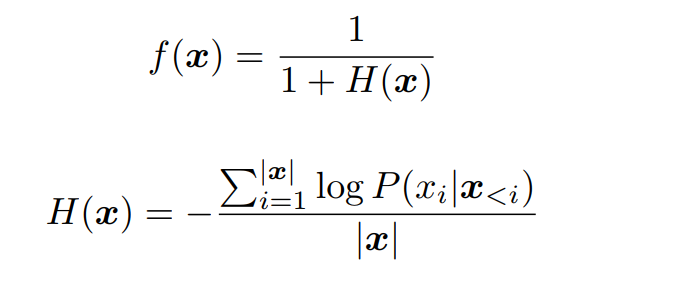 其中,P(x_i | x_<i)是给定上下文 x_<i 下 x_i 的概率,由 语言模型 计算得到,|x| 是句子 x 的长度。H(x) 是句子 x 的 交叉熵 ,范围为 [0, +∞)。因此 f(x) 的范围为 (0, 1]。