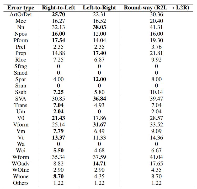 表 5:从左到右和从右到左的 seq2seq 模型对 CoNLL-2014 中每种错误类型的召回率