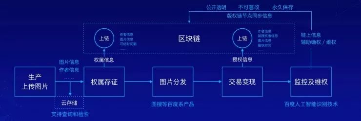 基于 区块链 技术的不可更改性,百度图腾打造了一个版权存证系统,可以为内容作品提供具有明确时间标记的“存在性证明”,从而构建了一个覆盖图片生产、权属存证、图片分发、交易变现、侵权监测、维权服务的全链路版权服务平台。