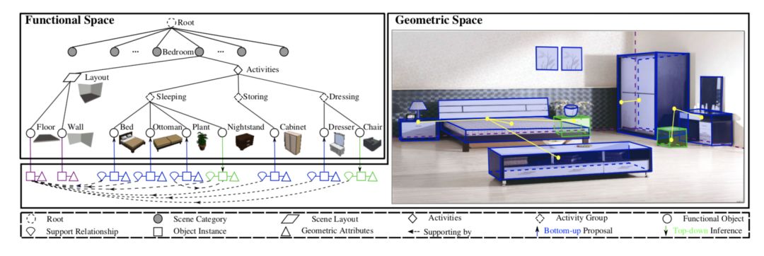 具体来说,我们利用一种整体场景语法(Holistic Scene Grammar, HSG)来展现3D场景结构,它表征了室内场景在功能空间和几何空间上的联合分布。HSG捕捉了室内场景中三个必要的隐含维度:1.隐含的人类背景,描述房间布置的功能可见性,2.场景结构的几何约束,3.物理约束,这保证了物理上合理的解析与重建。