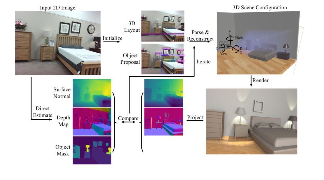3D表示由各个视觉模块初始化(例如对象检测和2D布局估计)。 联合推理算法将渲染的法线,深度和分割图之间的差异与输入估计后的RGB图像的差异进行比较,并不断迭代调整3D结构。