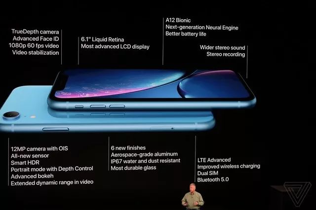 这款新iPhone命名为iPhone XR,采用LCD屏幕,有白黑蓝橙黄红六款配色。同样配置Face ID和A12处理器,没有3D Touch,1200万单摄摄像头,续航时间比iPhone 8 Plus提升1.5小时。