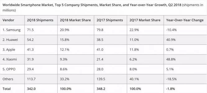 根据第三方机构统计的数据,在2018第二季度全球手机出货量排名中苹果已经跌落世界第三。第一名依然是三星,第二名则是华为。
