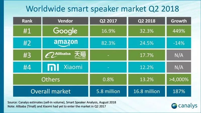 根据Canalys的报告显示,美国2018年一、二季度智能音箱总出货量为1680万台;谷歌Google Home系列出货量为540万台,亚马逊的Echo系列紧随其后,售出410万台。就在2017年的同一时间,亚马逊已经占据了美国7成以上的智能音箱市场。