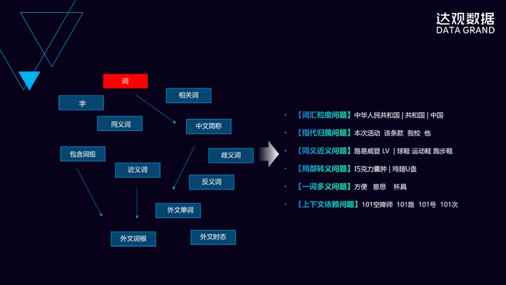 从分词的角度,我们可以看词本身的粒度问题,“中华人民共和国”和“中国”本身意义是一样的。还有指代归属问题,当人与人之间交流时候,你说的“你、我、他”能够自然而然的被替换成相应的目标,而计算机来解决指代归属问题也是非常难的一个事情。 除此之外,还有同义词、近义词、局部转义、一词多义等问题。