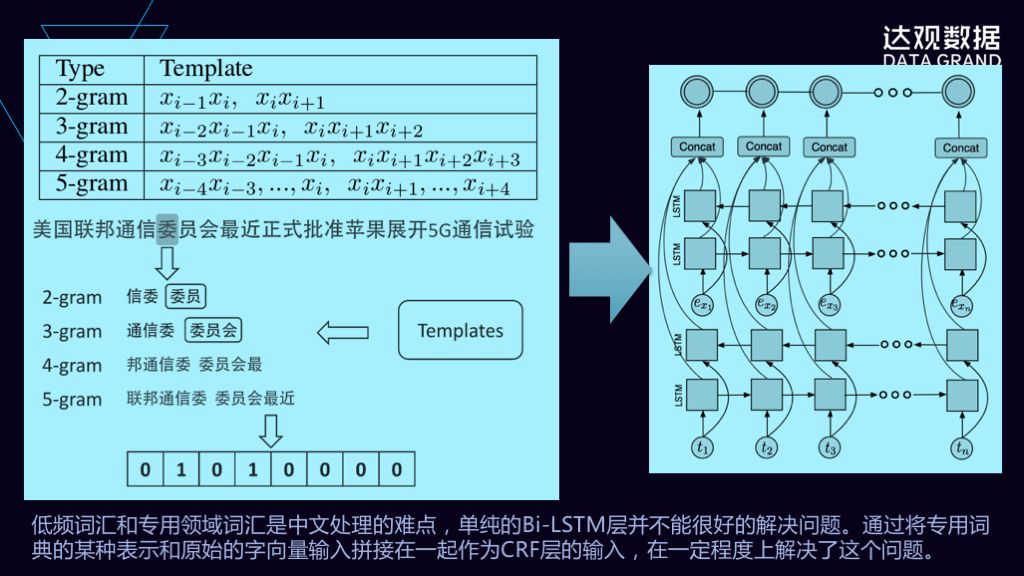达观数据 采用了一个方法,是把 低频词汇和 专业领域的词汇通过某种表示,和 原始的词向量一起拼接,作为 LSTM 和CRF的输入,来实现对这些低频词汇问题的解决。充分利用这些 深度学习 的模型和应用实践所总结出来的经验,我们可以非常高效的去处理像企业通常所遇到的合同、简历、工单、新闻、用户评论、产品说明这些文档。