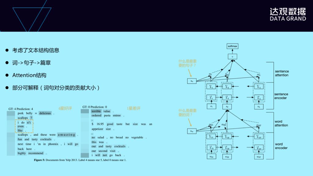 层次注意力模型是 最新的一个网络,它最早被使用来 对评论进行打分。层次注意力模型有一个非常大的优点,就是它 考虑了文本或者是篇章的结构,它是从 词开始,到 句子的一个注意力模型,再到 整个篇章是另一个 注意力模型。它另外的一个优点是可以 把整个网络结构的参数 可视化出来,来解释词、句子对目标的贡献的大小。