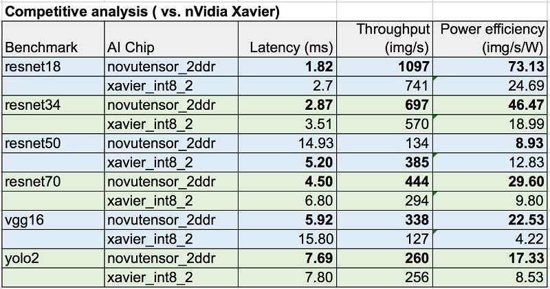 九天后,芯片正常运行;三周后,Benchmark测试出炉(如下图)。运行 ResNet-18 等各种测试,无论是吞吐量、延迟还是性能功耗比,NovuTensor 均优于 Nvidia Xavier芯片,而后者正是英伟达未来收入的重要增长点。