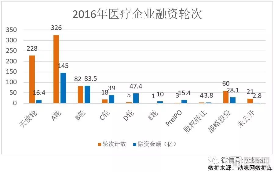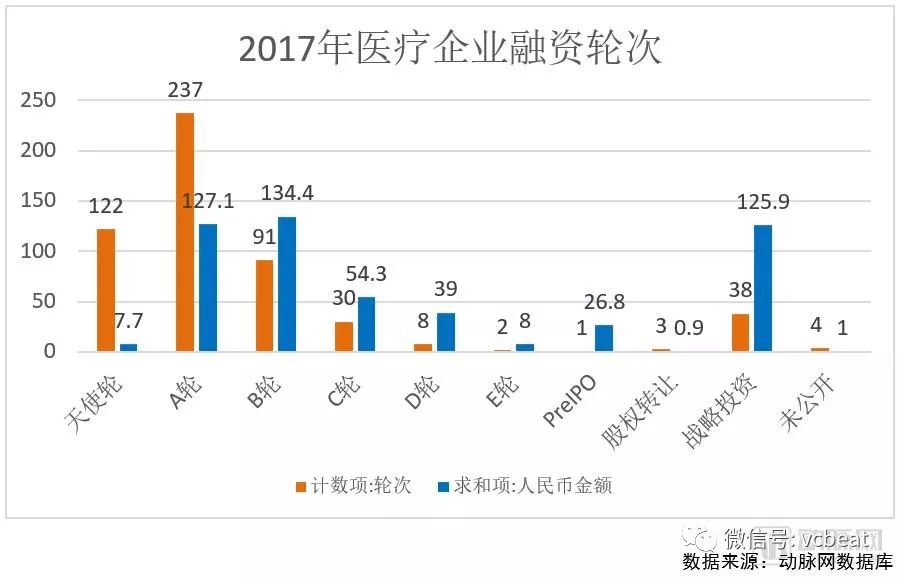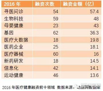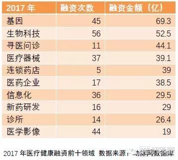 不少商业模式在被证伪后,资本在2017年主要的目光已经集中在有发展潜力,商业模式已经被验证的细分领域上。基因和生物科技快速崛起,寻医问诊类企业的融资金额虽然排到第三,但是融资次数已经大幅度降低到11次,机构更关注的是B、C、D轮次的成熟企业。