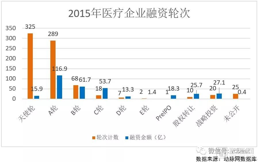 2015年是医疗行业大发展的一年,从企业获投数量和融资金额就可以看出,2015年全年融资次数765次,而2014年全年融资次数388次,融资事件的大幅增长带来的是总融资金额的大幅增长。