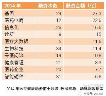 网上预约挂号,网上购药是2014年获得融资金额较多的互联网医疗类型,想用互联网改变人们的就医习惯。基因检测领域的初创企业在2014年也开始逐渐起步,但是当年的独角兽华大基因受到投资机构的追捧,完成多次融资,一家就拿走了20多亿的资金,基因技术未来发展的前景已经被投资机构所认可。