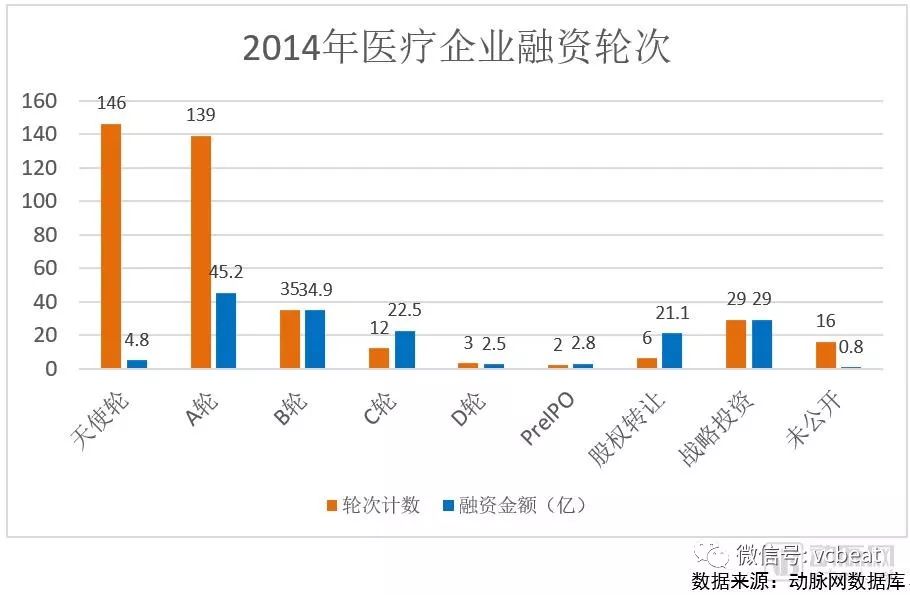 2014年是互联网医疗萌芽起步的一年,很多寻医问诊类型的初创企业诞生。他们通过移动互联的方式,想要改变医疗服务的流程,或者让医患双方用技术手段连接在一起。2014年的天使轮投资数量最多,达到146次,A轮企业也达到了139次。